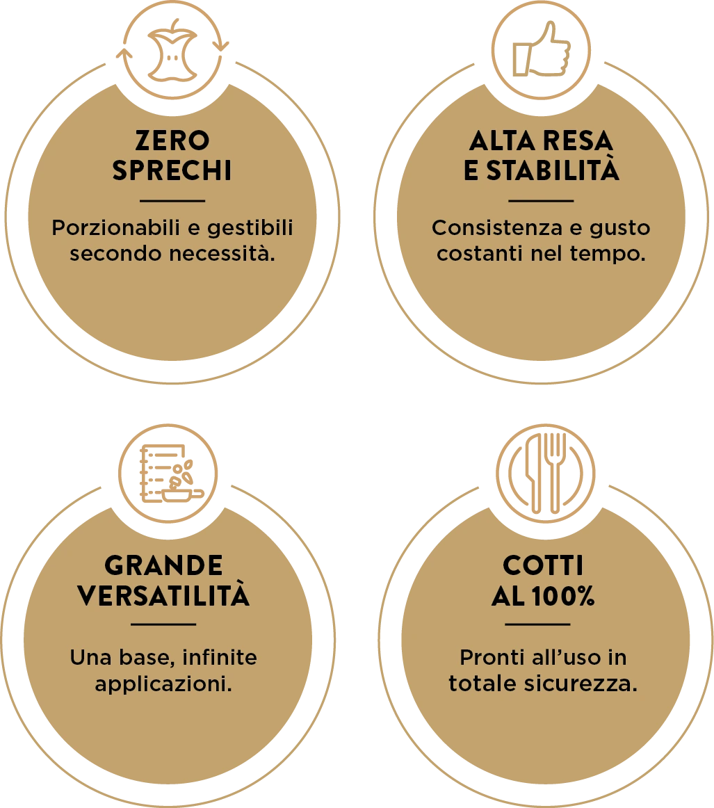 Preparazioni affidabili, dal gusto riconoscibile, ideali per ottimizzare tempi, arricchire le proposte del menu e l’ organizzazione in cucina, garantendo qualità costante anche nei momenti di maggiore affluenza.